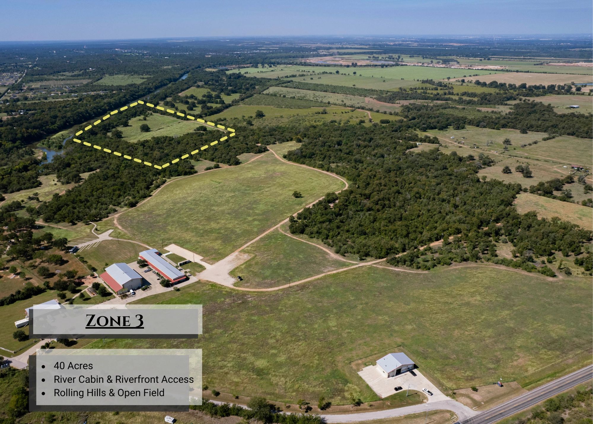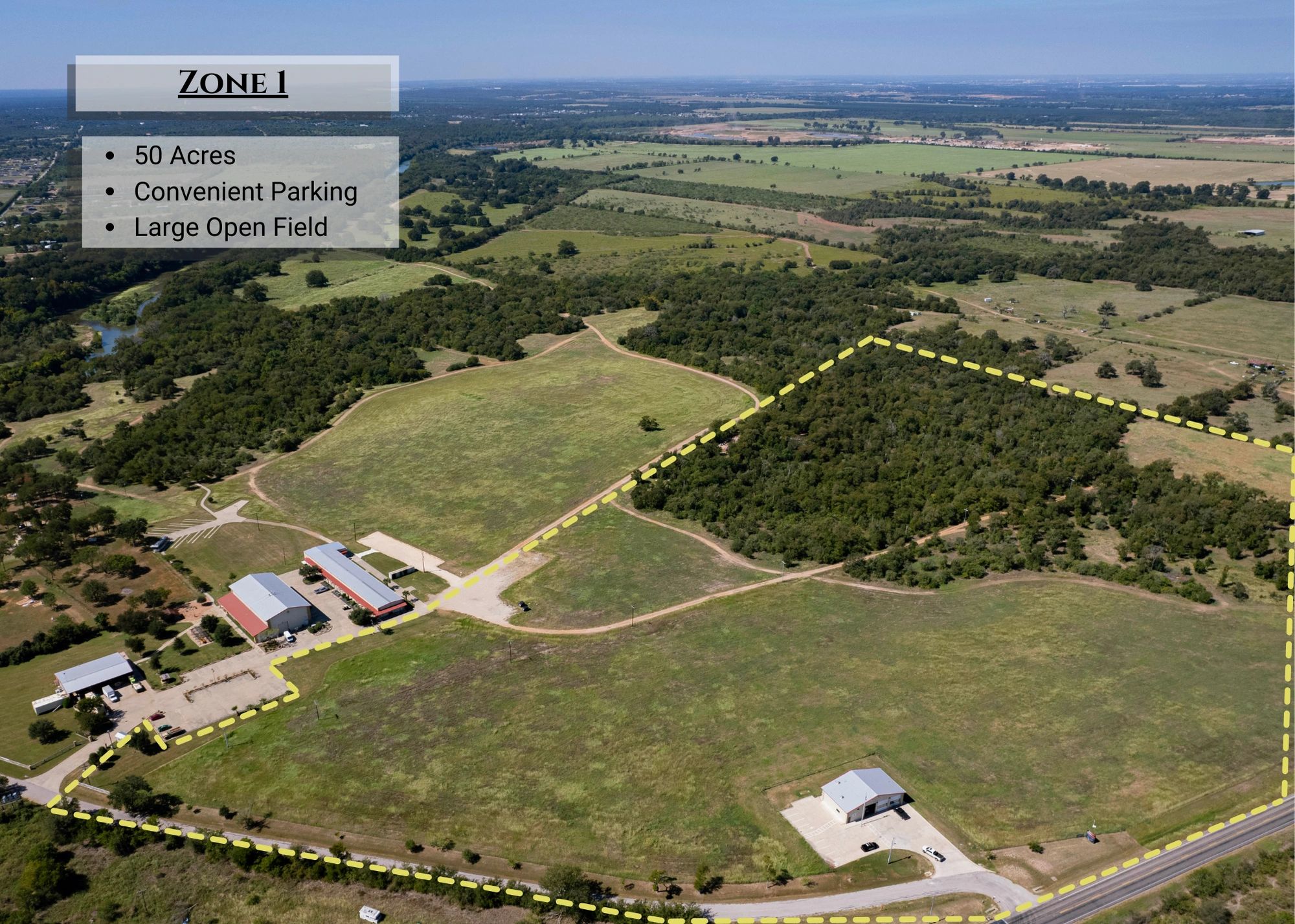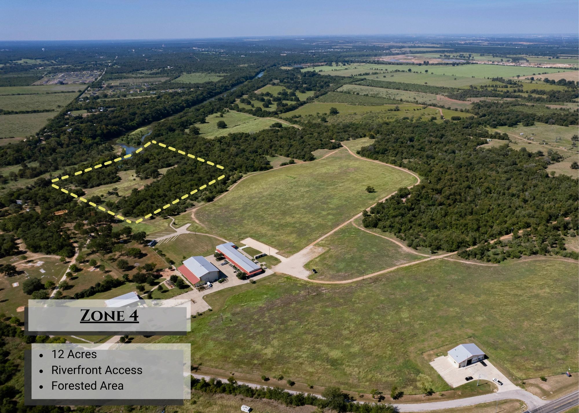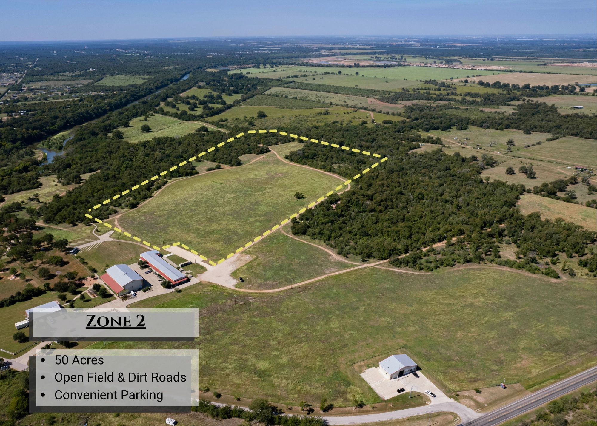 Right along FM 969 with convenient parking. This zone features dirt roads, forested areas, and open fields.